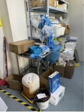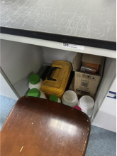 个别实验室也存在一些安全隐患问题:(1)冰箱旁堆放泡沫箱;废液瓶及实验用料瓶罐未放置相应位置(C413-2室);(2)充电器未拔(C412室);(3)部分实验室和休息室存在卫生脏乱、值日安排不到位的情况,包括:①室内较杂乱,需规整。(C419室、C413-1室);②地面较脏;室内环境较杂乱;休息室存放较多烹饪调料;未安排卫生值日表(C412室);③值日表时间未更新(C413室)。