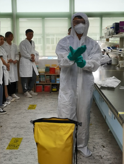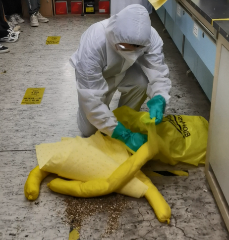 实验室试剂泄露应急演练在药科楼B509举行。实验室协管员肖鸬华讲解化学品泄漏应急包的使用并进行完整演示,包括防护服的穿戴,泄露化合物的掩盖、吸收及处理等操作。演练模拟学生在实验操作过程中因操作不当发生溶剂泄露事故,后迅速启动应急预案,组织危化品泄露应急救援人员开展应急处置。