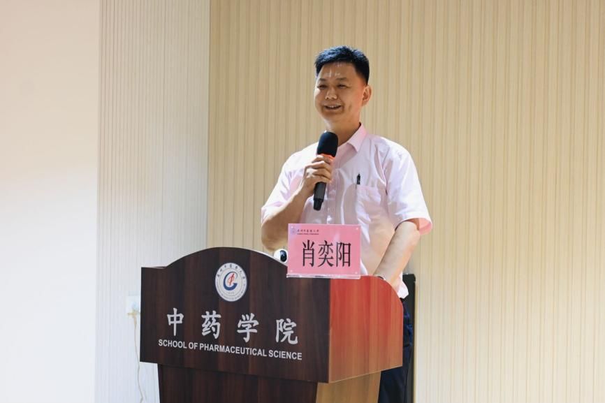 学院91级校友、大翔医药集团有限公司副总裁肖奕阳代表企业讲话。他与同学们分享了回到母校的喜悦,以及与企业共同成长和发展的历程,希望母校在高质量办学中稳步向前,寄语师弟师妹们谨记校训,志存高远,展现广中医学子的担当。参会人员共同观看了大翔集团的宣传视频,学习了大翔集团“有容乃大、展翅翱翔”的企业文化。