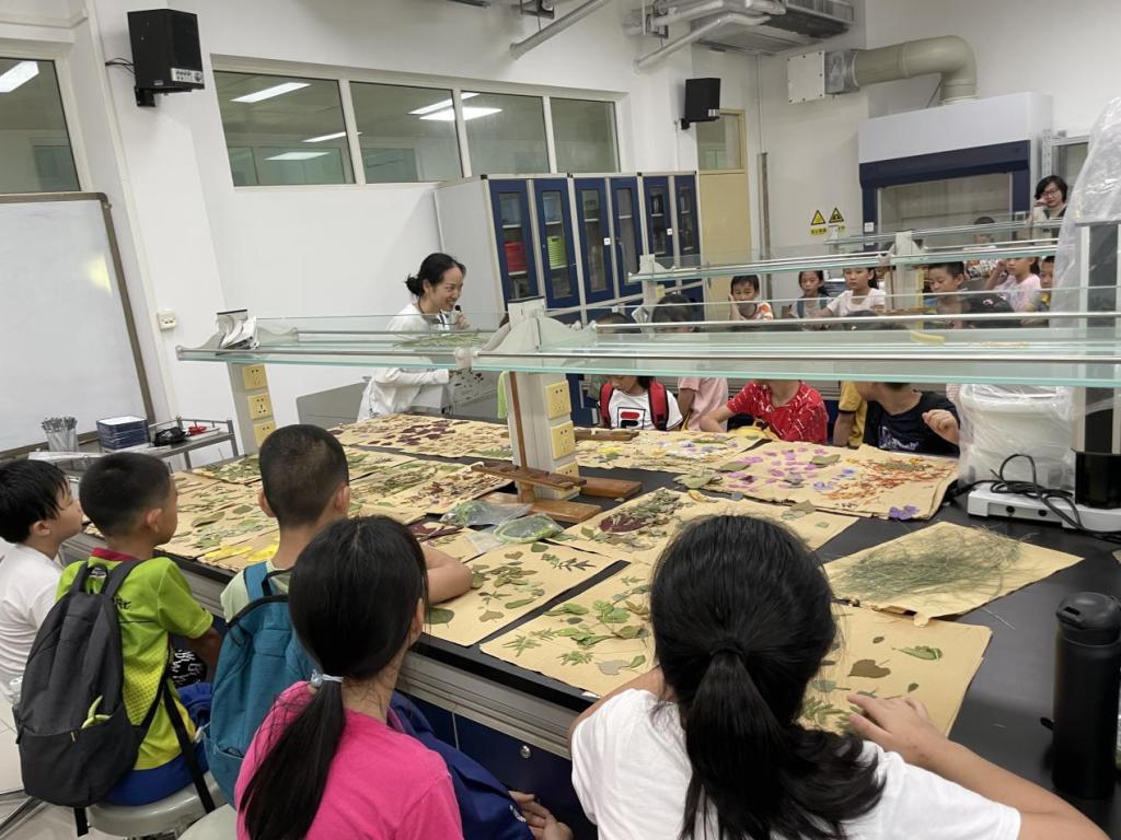 随后,孩子们在父母的陪伴下,在老师的指导下分组参观了药王山、时珍山。经过全面改造的药山,在夏日的阳光下,显得更加美丽。孩子们好奇的听着带队老师对各种药用植物的讲解,并不时提出“它为什么能够减轻胃胀”等问题,老师们都一一给予解答。在药山上,大人小孩一同采集植物标本、摘毛豆、绿豆等并收集有趣的果实种子,还采摘、品尝山上的龙眼。在实验室,孩子们在老师的指导下,把采集的植物做成各种好看的标本,并尝试制作中药香囊。