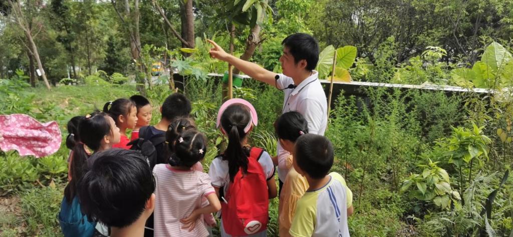 (带队的彭光天老师给孩子们讲解认识植物)