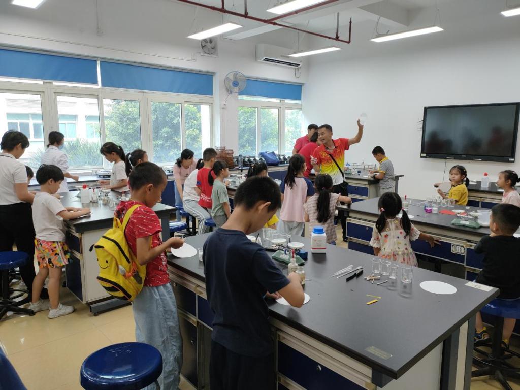 休息之后,孩子回到实验室体验了有趣的化学实验,认识了托天平等实验仪器,并通过酸碱实验、白纸的秘密、杯中彩虹等简单有趣的实验,了解其中蕴含的科学道理。