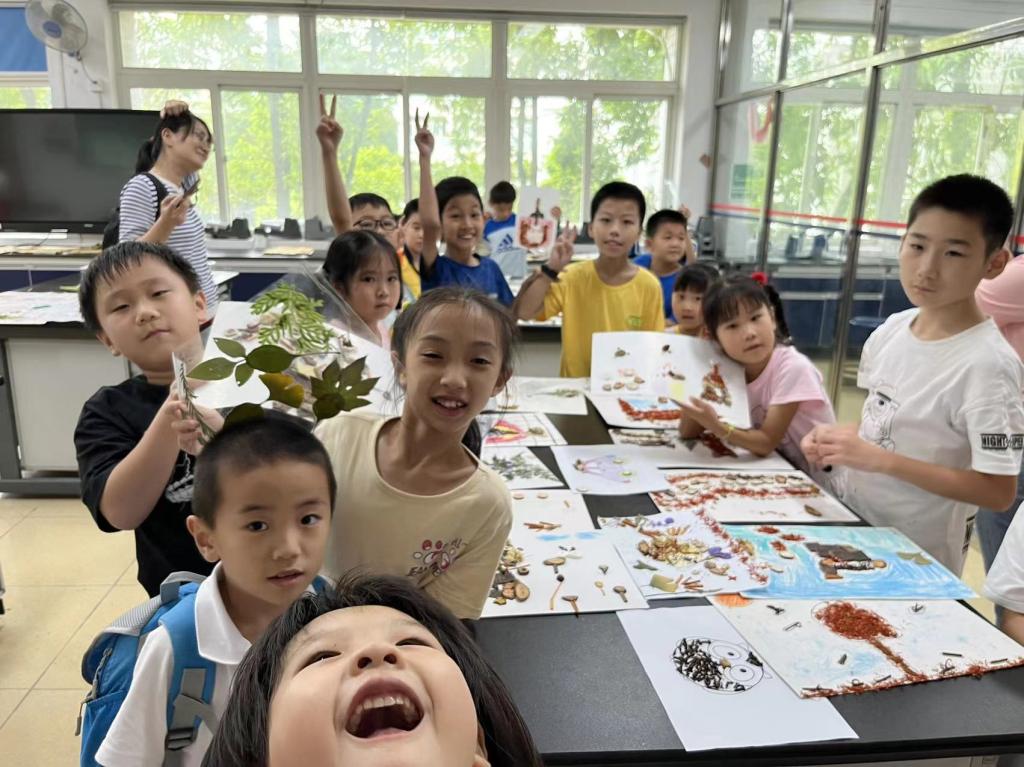 午休之后,孩子回到实验室,在老师以及家长的指导下,手工制作植物粘贴画。小朋友们欣赏着自己做的植物拼画,露出天真的笑容。