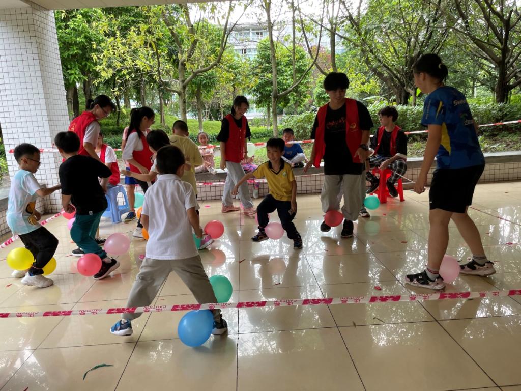 (孩子们与志愿者一起玩踩气球趣味游戏)