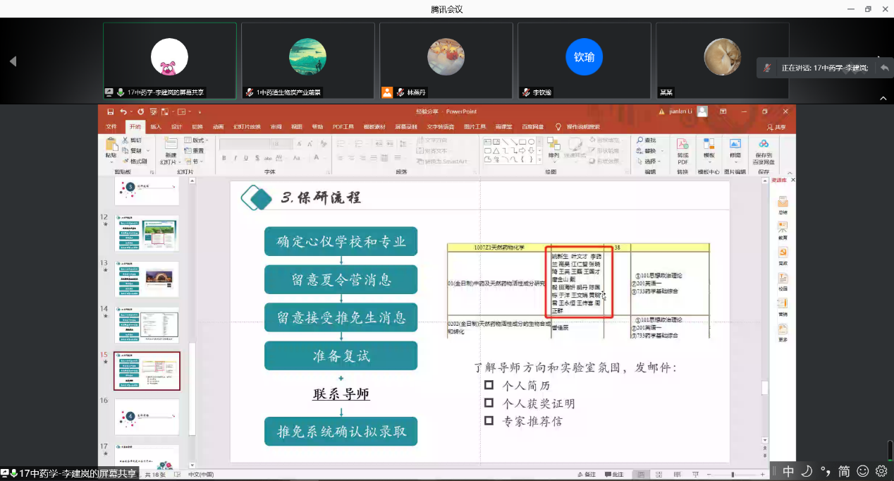 会议开始前,田老师为本次大会致辞。他对分享嘉宾表示了感谢,并希望立志考研的同学珍惜这次机会,学习师兄师姐们的宝贵经验,为以后的研途奠定基础。随后分享会正式开始。首先,陈碧海师兄围绕考研重要时间节点、复习计划、考研信息及参考书目四大主题,详细为同学们分享了考研相关经验。随后,余俊河师兄通过读研初心、保研过程及个人经历三部分进行保研经验分享。他强调,绩点排名及诚信品格是保研前提,做好充分准备是顺利保研的奠基石。接下来,李雨青师兄从考研心态、学习状态调整、中药学专业课复习几个方面给了同学们切实可行的建议。最后,李建岚师姐结合官网保研文件,为同学们详细讲解了保研的各项要求及流程,并分享了她的学习方法。在每位嘉宾的分享后,均设置了提问互动环节,同学们都积极地提出自己的疑惑,四位师兄师姐皆耐心的一一进行了解答。