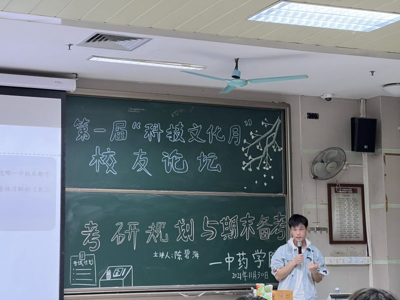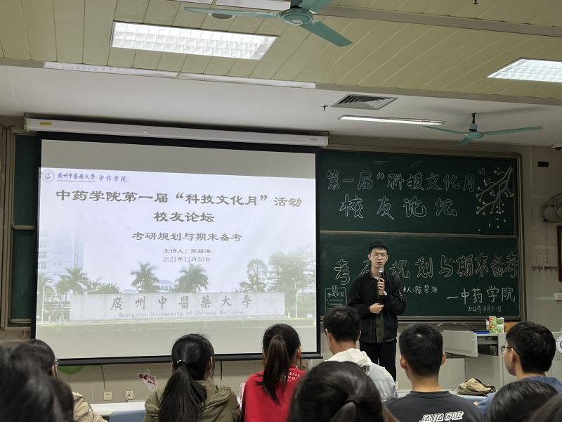 2021年11月30日晚19点,21级中药学1、2、3班在综合楼302举办437必赢会员中心第一届“科技文化活动月”之校友论坛活动,特别邀请陈碧海校友来为大一新生做期末备考经验分享。班级辅导员张子希老师出席并主持。