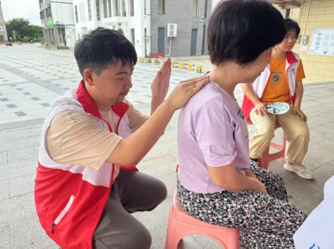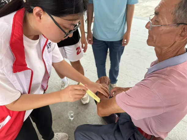 队员们在镇隆八坊文化广场连续八天开展健康服务活动,为当地居民提供量血压、推拿、艾灸及贴耳穴等便民服务。队员们的热忱态度与专业服务赢得了居民的一致认可,大家的夸赞声、亲手送来的热粥和水果,都化作了激励队员们继续前行的动力。