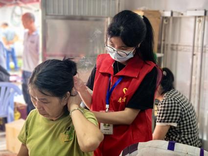 尽管骄阳似火、暑气蒸腾,队员们始终耐心细致:细心地为居民们测量血压,耐心给出保养建议。他们依托专业知识,在进行艾灸与推拿时,向居民介绍特色中医药理论,热情分享日常保健穴位和推拿手法。老人们在娴熟的手法中舒展了筋骨,孩子们也好奇地感受着艾灸、推拿的奇妙功效——这一幕幕,正是中医药文化在互动中代代相传的生动注脚。