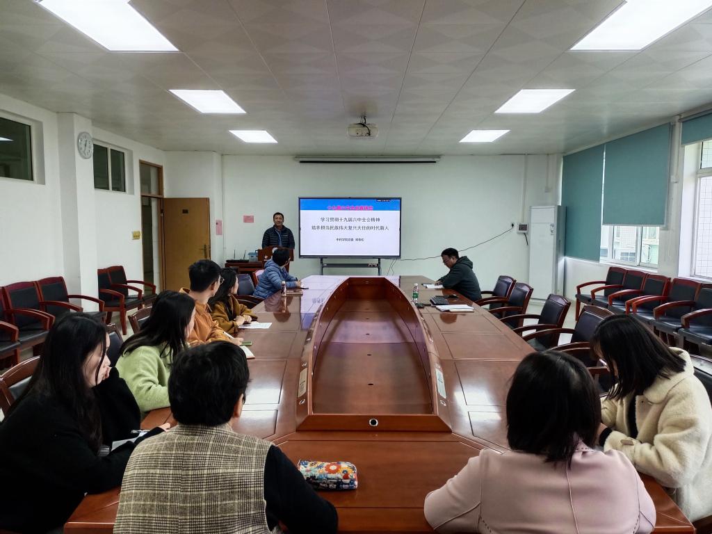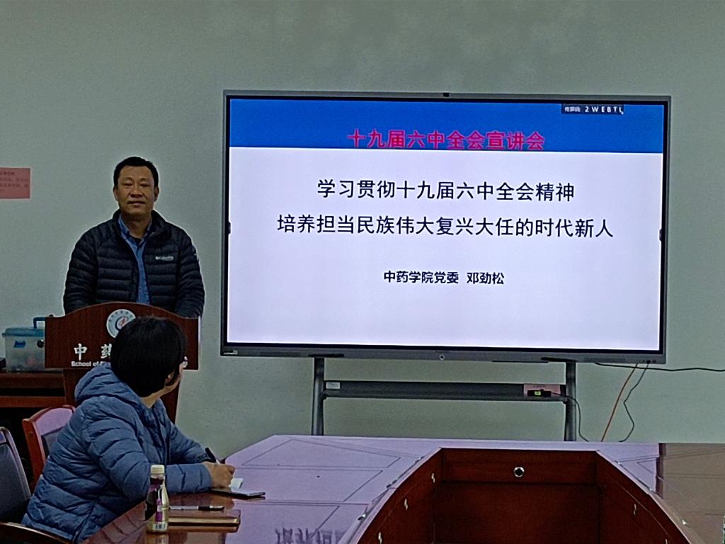 12月22日中午,437必赢会员中心党委书记邓劲松在药科楼A419为所在行政党支部党员以及全体辅导员宣讲党的十九届六中全会精神。