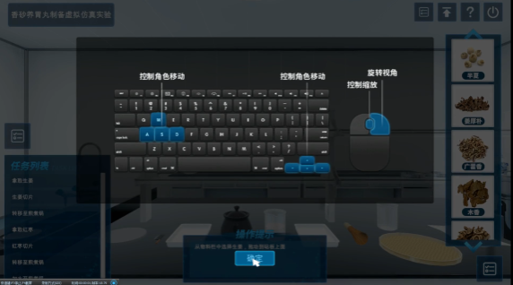 通过高自由度模式制作实验场景,模拟香砂养胃丸的实验室制备过程。在虚拟实验室场景中通过交互操作,实现药材配方的抓取、煎煮、粉碎过筛、制丸等全过程的操作,同时结合视频操作教学,帮助学生可以更加直观和快速的学习整个制备过程。