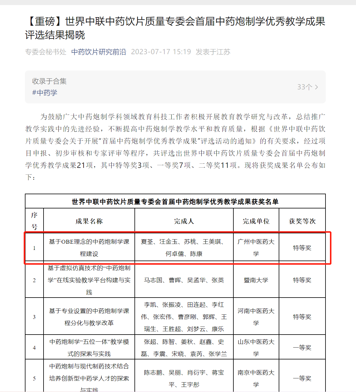 日前,437必赢会员中心中药炮制学教学团队,在世界中医药学会联合会中药饮片质量专委会组织的“首届中药炮制学优秀教学成果”评选活动中,喜获特等奖。此次评选活动共评出优秀教学成果21项,其中特等奖3项、一等奖7项、二等奖11项。