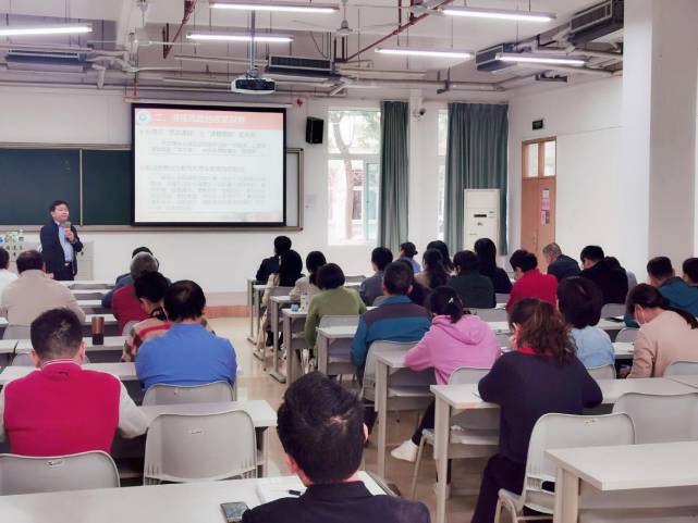 曾元儿处长从实施课程思政实施的背景和意义、课程思政的改革探索、《分析化学》课程中如何挖掘思政元素三个方面与学院教师进行分享。他认为“课程思政”是将思想政治教育贯穿融入到专业课教学当中的有效教学手段,是实现“立德树人”这一教育核心环节的有效途径。专业课教学中具有较丰富的思政教育元素,经过教师“隐性教育”润物无声的方式精心设计与引导,促使学生在获得专业知识、提升技能的同时,潜移默化地形成关爱他人、尊重生命,具有社会责任和担当的价值观。随后,曾处长为学院教师们在课程思政推进中遇到的困惑与问题进行解答与指引。讲座最后,龙泳伶副院长代表学院感谢曾处长为老师们带来一场深刻而生动的思政教育讲座,为老师们做好“课程思政”改革打开了思路,对学院深入推进全员、全程、全过程育人格局提供了指引。