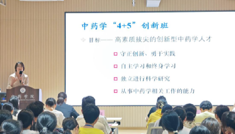 白莎莎副教授对中药学4+5创新班的培养目标及要求等作了详细介绍。她表示,创新班是为进一步培养中医药科研事业高素质人才而开设,本科阶段培养方案具有一定专业特色,且为丰富学生国际化视野,学院计划于第三学期派送创新班学生至澳门科技大学进行交流访学,希望同学们能够志存高远,守正创新、脚踏实地、勇于实践,为推动中医药事业发展而努力。