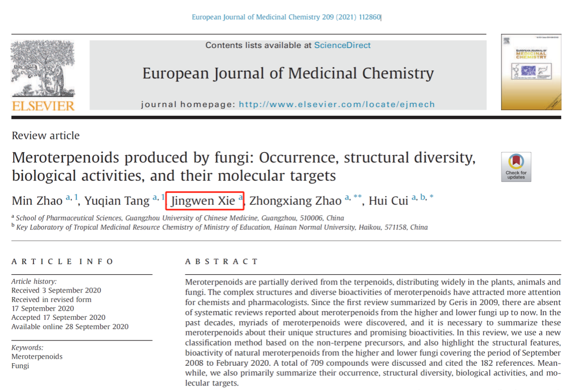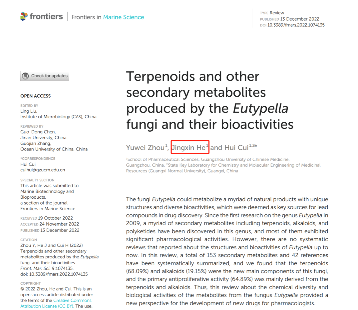 此外,该团队很重视本科生的科研素养训练,并指导多名本科生发表SCI论文(Fitoterapia,2024,105804,中药学潘凯慧,第七作者;Front. Mar. Sci. 2022, 9:1074135, 制药工程何警新,第二作者;European Journal of Medicinal Chemistry,2021,209,112860,药学谢静雯,第三作者)。