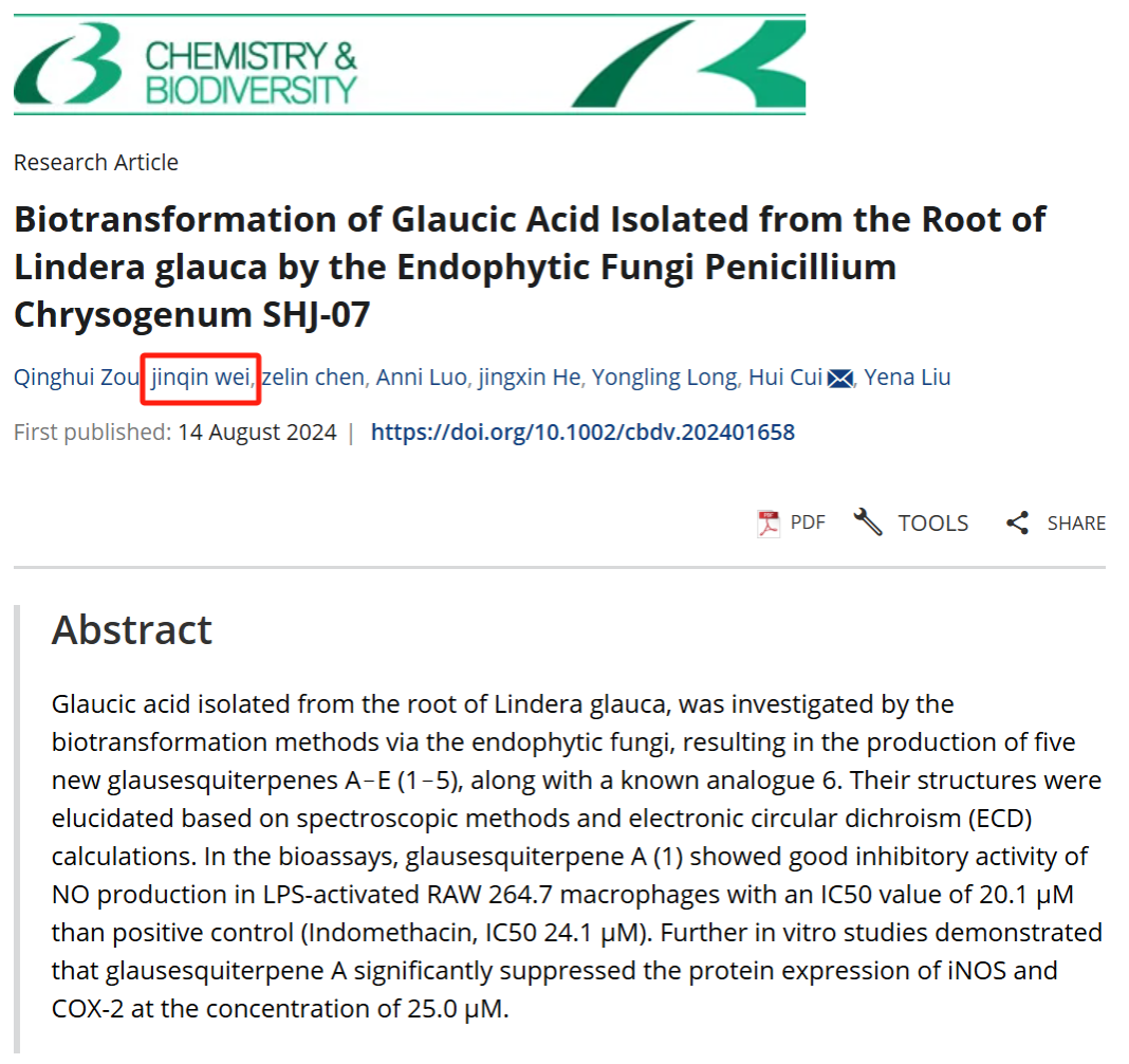 近日,中药学4+5创新班本科生魏劲琴,在导师崔辉副教授的指导下,依托本科生创新性实验室培育项目,围绕民族药山胡椒中萜类活性物质及抗炎活性研究,以并列第一作者在SCI收录期刊(Chemistry & Biodiversity)上发表论文。