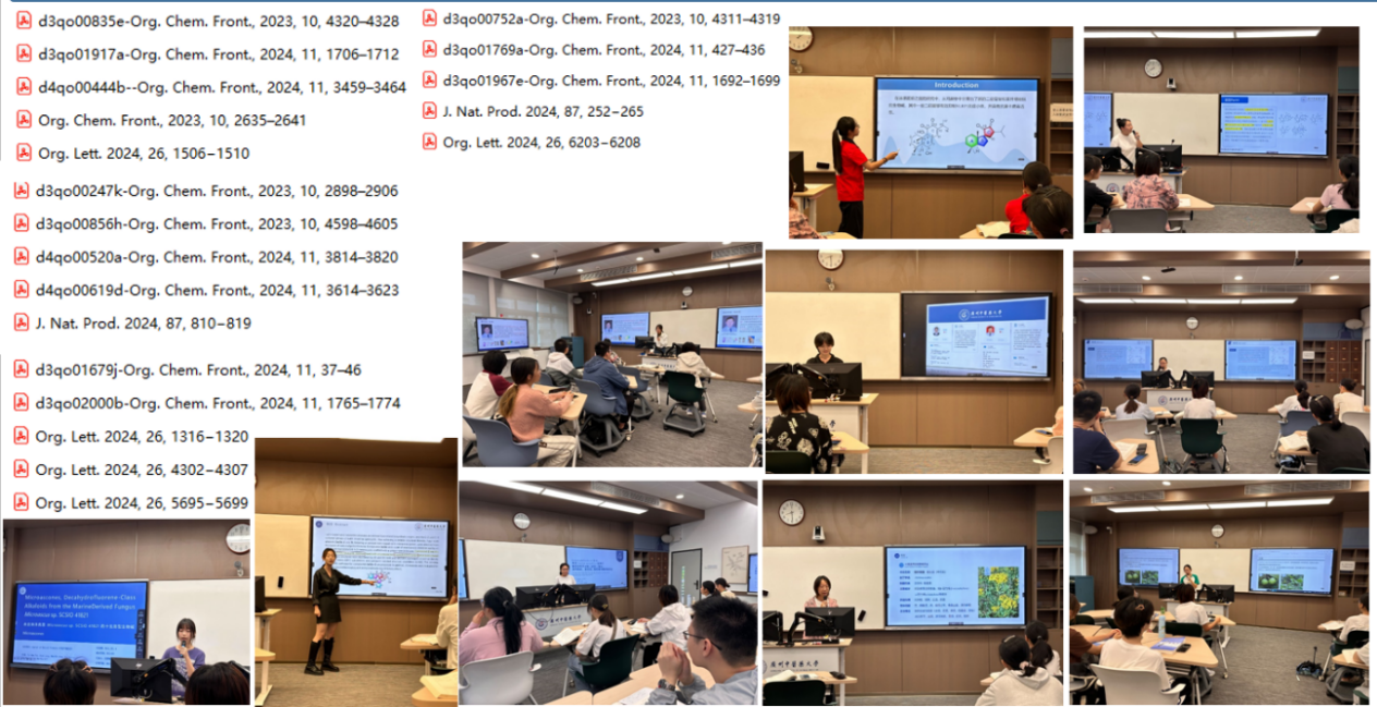 2024年12月11日上午中药学“4+5”创新班在教学楼A210进行《中药化学》权威期刊Online文章学期末总结汇报。从本学期初开始,课程负责老师张翠仙教授结合《中药化学》课程内容,精选一区TOP期刊(Organic Letter、Organic Chemistry Frontiers、Journal Natural Products)Online文章22篇,学生自由选择(人均至少一篇且不重复),进行学生课堂前10分钟文章内容PPT展示。学期末根据课程内容和学生精读文章结构特征自由组合,通过文献对比阅读,进行小组课堂展示,教研室何细新教授也参与本次课堂展示。课程实施受到学院领导的重视,白云龙副院长(主持工作)、王建刚副书记、龙泳伶副院长亲临课堂展示现场,靳红磊副院长进行课程督导。