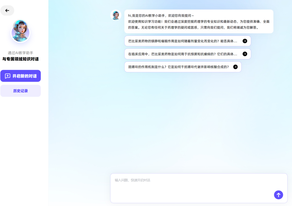 在《药理学》课程中,AI助教全程伴随学生学习,利用自然语言处理、深度学习和知识图谱技术提供个性化辅导。通过与知识图谱的智能交互,AI助教精准推荐学习资源,解答疑难问题,并根据学生的薄弱环节提供定制化支持。它通过多轮次智能问答帮助学生理解复杂概念,如药理作用和作用机制等,确保学生在自己的节奏下获得实时指导。