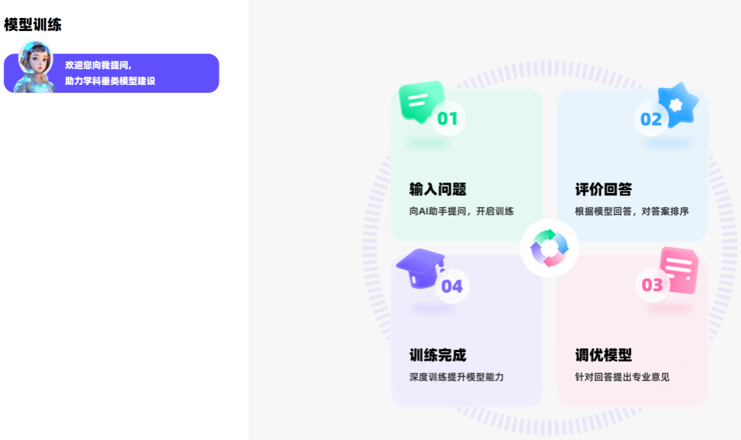 在《药理学》课程的模型训练中,教师通过与AI互动,不断优化模型的回答精度。教师向AI提出与课程相关的问题,AI根据问题生成多个答案,涵盖不同层次的知识。教师根据这些答案的准确性和深度提供反馈,持续优化AI模型,逐步提高其智能化和精准度,最终为教师和学生提供个性化的教学支持。