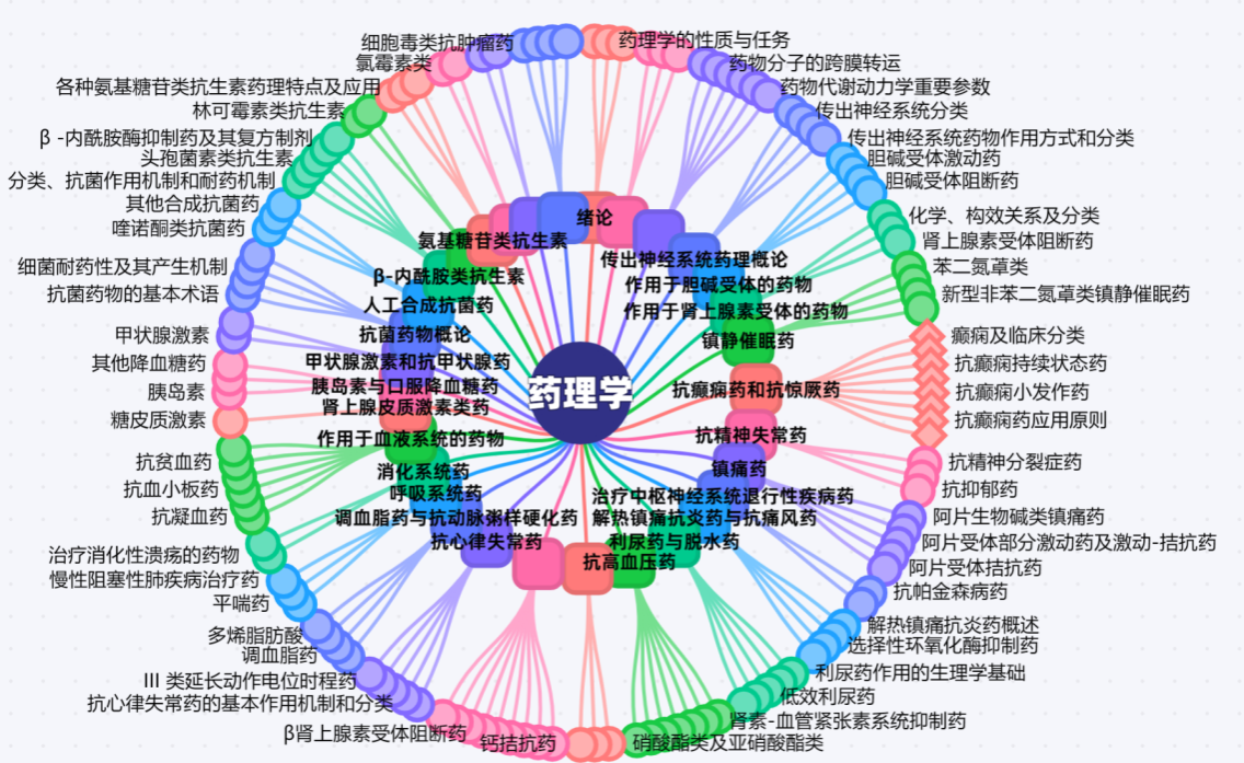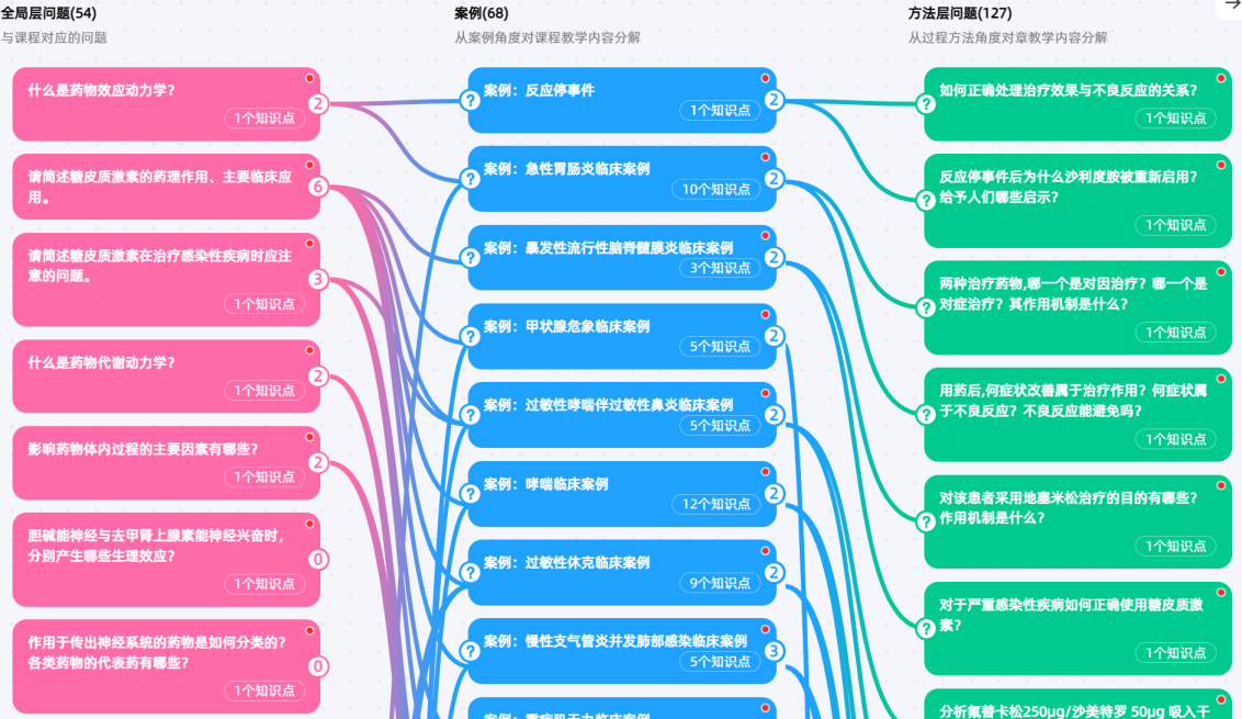 在《药理学》课程的知识图谱构建中,课程团队采用了“临床用药案例驱动”的教学特色,通过将核心知识与实际临床用药案例结合,推动学生的主动学习和应用能力。学生在解决临床病例时,不仅学习基础药理学知识,还通过各种案例,深入理解药物的作用机制及不良反应。