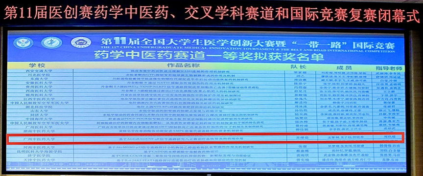 7月7日,第十一届全国大学生医学创新大赛药学中医药、交叉学科赛道暨“一带一路”国际竞赛复赛圆满收官。437必赢会员中心周玖瑶老师指导的《基于AGEs/RAGE/NF-kB信号通路研究八正散治疗急性肾炎的药理作用》项目团队在激烈竞争中脱颖而出,荣获药学中医药赛道复赛一等奖,成功晋级2025年8月在山东大学举办的全国总决赛,即将在国赛舞台上与国内顶尖高校学子同台竞技。