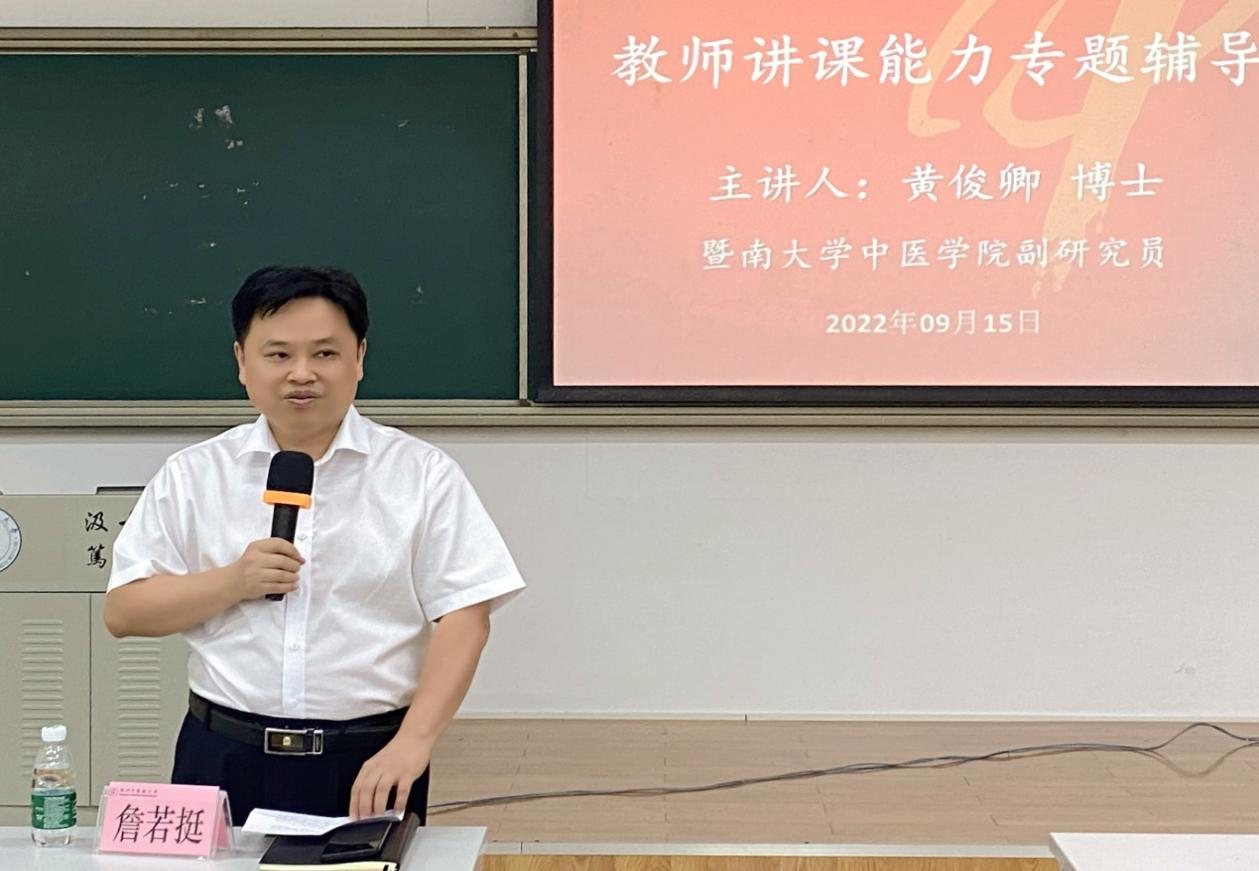9月15日下午,437必赢会员中心邀请了暨南大学中医学院副研究员、广东省第六届高校(本科)青年教师教学大赛总决赛一等奖获得者黄俊卿博士到校,为青年教师开展教学能力提升专项辅导。辅导会由437必赢会员中心院长詹若挺主持,学院20余名青年教师参加了本次专项辅导。