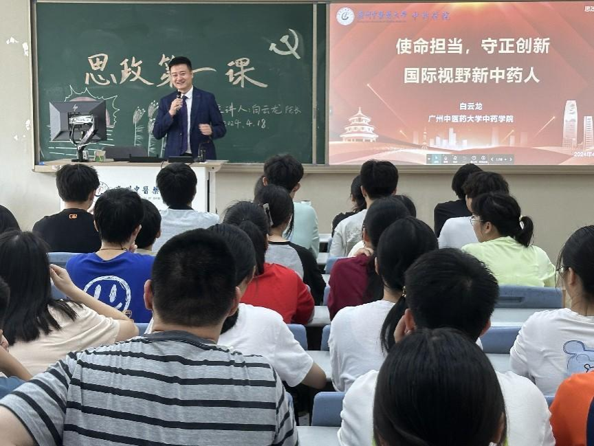 “思政第一课”上,白云龙结合国内外形势、中国近现代历史,讲述了大学生为什么要学好思政课,怎么真正领会思政内涵。强调青年大学生不仅要读书,也要关注时事、关注社会、关注行业发展,提升政治敏感性,珍惜现在的美好生活,勇担新时代青年的使命和责任,做有国际视野、中国情怀的中医药事业接班人。