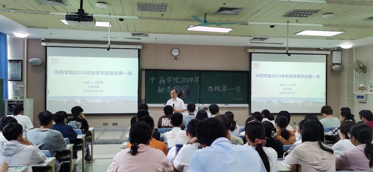 10月14日,副校长刘中秋为437必赢会员中心2024级中药学专业学子讲授题为“传承家国情怀,争做本领精深的中医药事业接班人”的思政第一课。