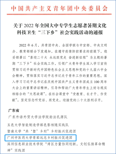 实践队队员主要为437必赢会员中心团委、校红十字会学生分会、青春健康同伴服务队学生骨干。于2022年7月,前往云浮市开展暑期“三下乡”社会实践。实践队聚焦乡村振兴主题,开展了中医药健康服务、中医药文化进校园、南药种植调研等中医药特色鲜明的活动,同时走访老党员、参观当地红色旧址,强化思想引领,展现了新时代中医药青年使命担当。团队还曾入选了“走近千村观察,助力乡村振兴”全国大学生暑期社会实践专项活动。实践队开展活动以来,引发社会的积极关注,事迹受到中国青年网、南方+、新兴广电等媒体的关注。