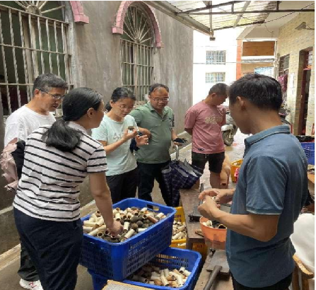 化州平定镇是化橘红的道地产区,其中,大岭村是当地最早种植化橘红的乡村,种植橘红历史悠久、种植面积大。在大岭村,在当地农户的带领下,老师们针对结对企业提出的需求,走进化橘红种植基地,拜访种植经验丰富的农户,了解种植土壤、品种、施肥、田间管理、病虫害防治、市场情况等方面信息。同时,在农户的手工加工作坊,体验和了解化橘红传统炮制、切片等技术。