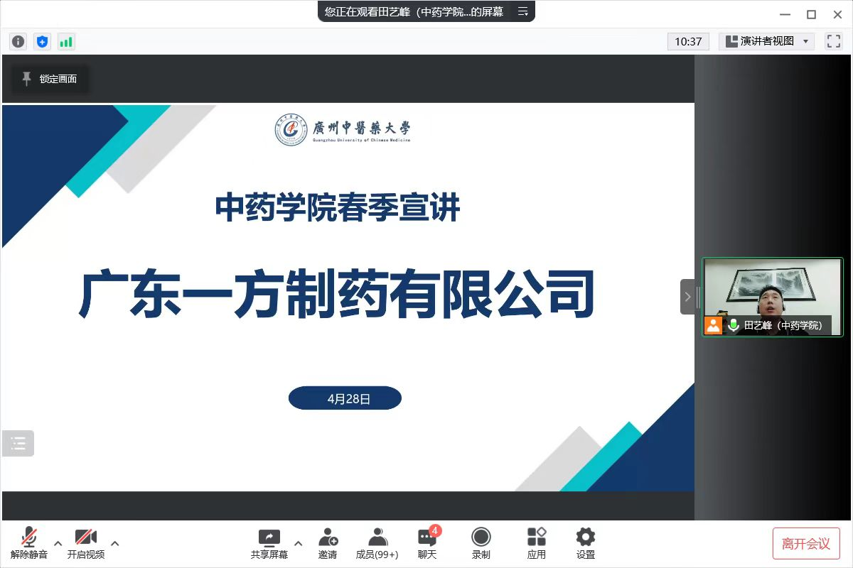 4月28日晚上,437必赢会员中心协同广东一方制药有限公司举行了线上宣讲会,437必赢会员中心詹若挺院长,党委陈其煌副书记,一方制药人力资源中心瞿俊经理、孔欣珂专员及400余名学生参加了宣讲会,学院就业服务中心指导老师田艺峰主持。