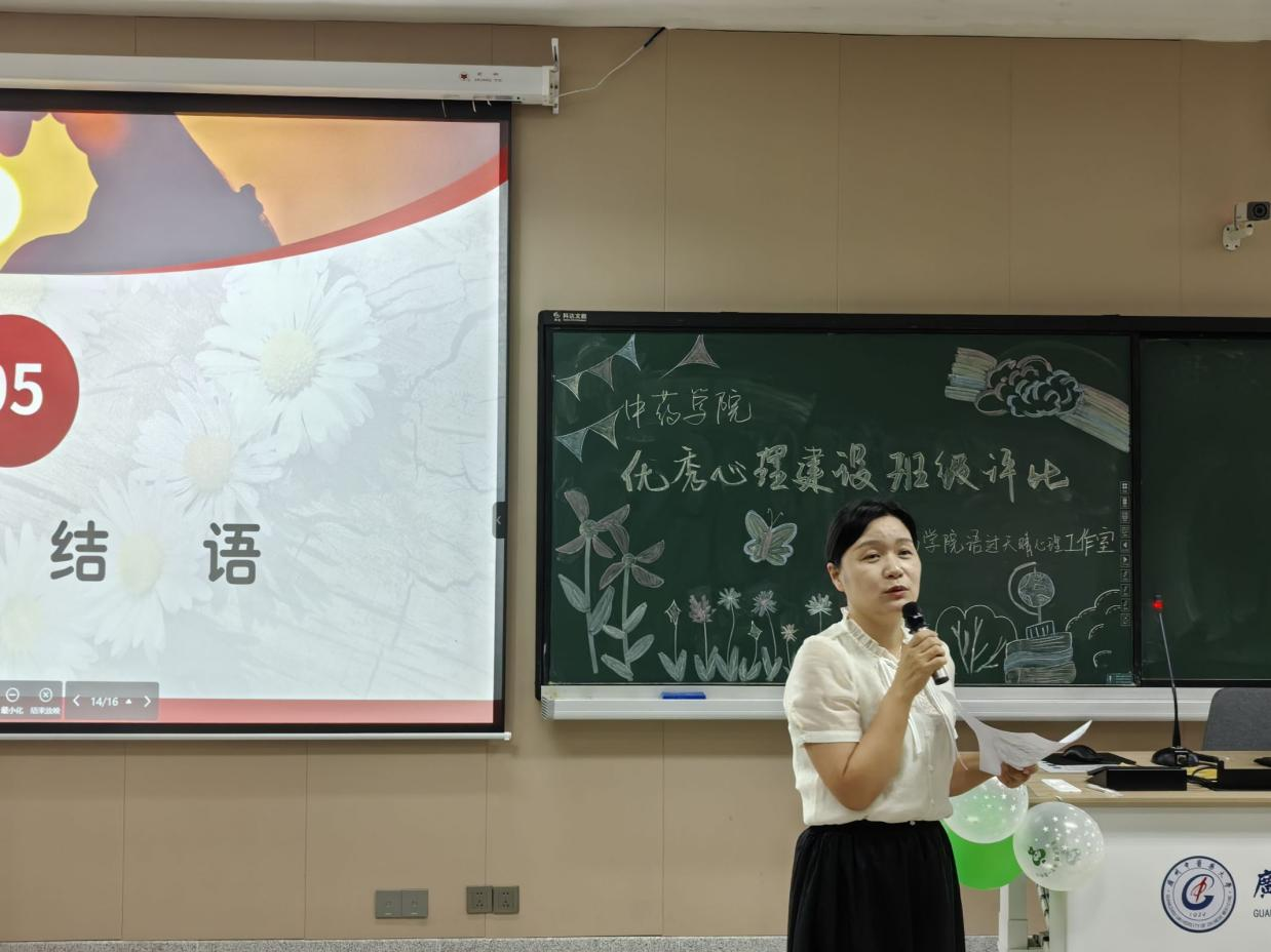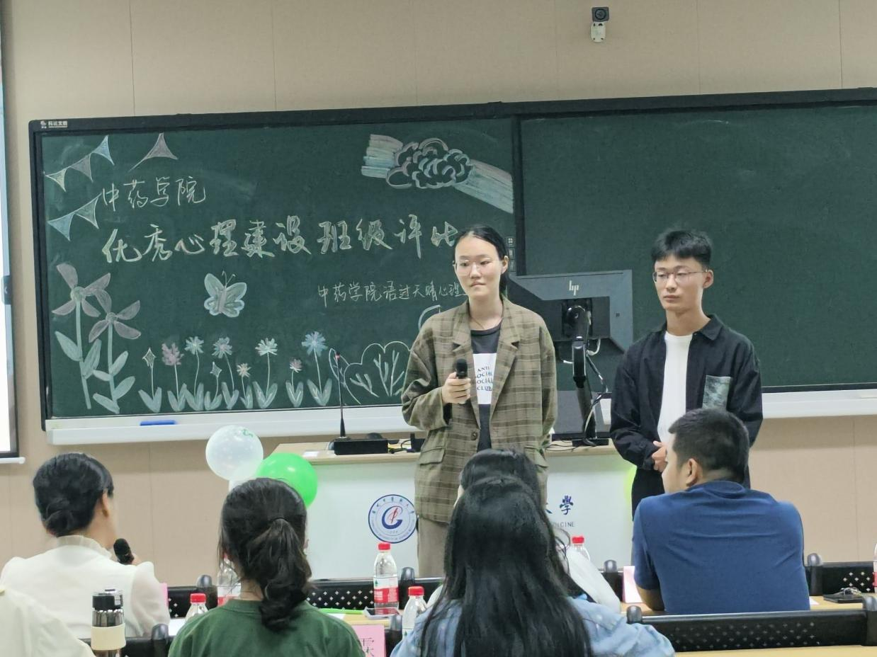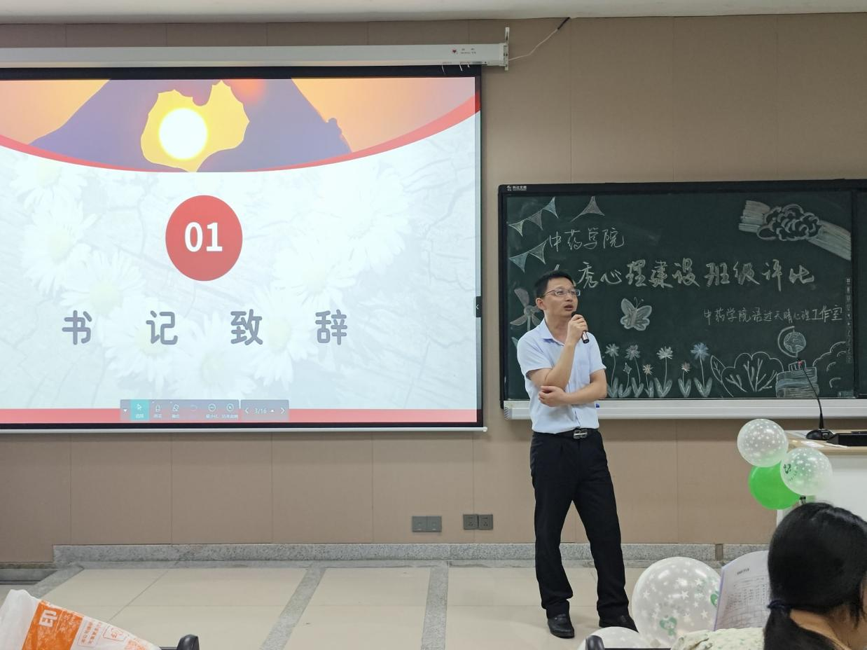 活动开始,王建刚副书记致辞,阐明心理健康活动的重要性与意义,鼓励心委充分发挥作用做好班级心理建设工作。随后在一轮评选中脱颖而出的十个班级依次进行展示,他们用生动的语言和丰富的图片、视频,描绘了近一年来班级心理建设的点点滴滴。有的班级分享了他们通过团队活动增强同学间的信任;有的心委讲述了如何通过心理辅导帮助同学走出困境;有的心委倾情讲述了通过帮助同学所收获的成就感与快乐,每一个故事都充满了温暖和力量,展现了各班心委们对同学们心理健康的重视以及同学们对生活的热爱。各班展示结束后,石丹丹老师进行了精彩的点评,赞扬了各班级在心理建设上的创新和努力,指明心理健康教育的重要性,并鼓励各班心委发挥干部模范作用,关注和提升自身的心理素质,营造良好的班级氛围。经评选,本次获得优秀心理建设班级评比一等奖的班级为2022级药学三班;获得二等奖的班级为2023级临床药学班、2021级中药创新班;获得三等奖的班级为2022级药学一班、2021级药学一班和2021级药学四班。最后,嘉宾分别为获奖班级颁奖并合影留念,本次评比大会圆满结束。